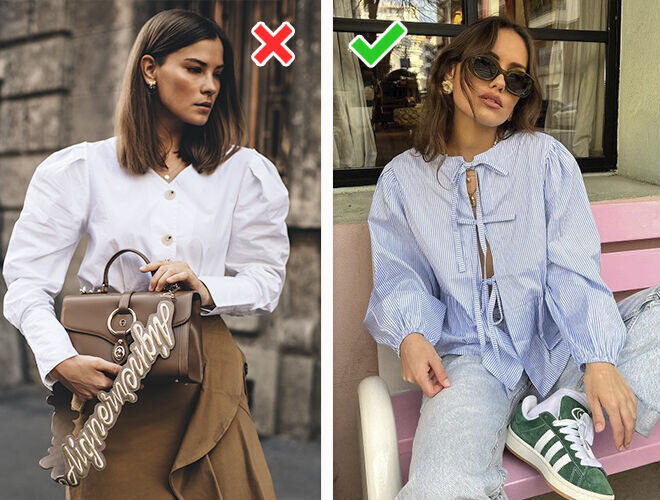 Почти все тренды (кроме микротрендов) мы носим годами — за это время они успевают наскучить и, соответственно, выходят из моды. Такое мы уже проходили с рубашками с гипербуфами, многоярусными платьями, укороченными скинни и другими хитами прошлых лет. Отказываемся от вещей, которые вызывают тоску, и носим свежие и безумно красивые тренды 2024 — они будут актуальны еще несколько лет! Рубашка с гипербуфами vs рубашка на завязках Антитренд: рубашки и блузы с гипербуфами из плотной ткани. Легко превратят в Халка даже самую хрупкую девушку. Повестка power woman начала утихать, уступая место гиперженственности, а значит, отходим от чрезмерного размера плеч. Тренд: рубашка с завязками вместо пуговиц, из мягкого материала. Буфы заменяем изящными епископскими рукавами. Такая новинка придется по вкусу утонченным натурам и легко впишется в любые сочетания. Укороченные скинни vs скинни полноценной длины Антитренд: потертые скинни в облипку, укороченной длины. Джинсы, которые выглядят на пару раз
