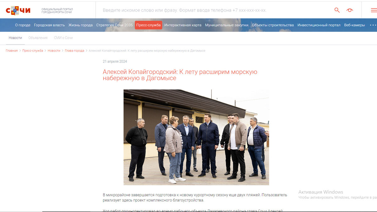 На днях на официальном сайте администрации г. Сочи, нашел интересную статью про пляж Дагомыс! Датируется она 21 апреля 2024г. Вот вырезка – К лету подготовим в Сочи более 170 благоустроенных пляжей для наших жителей и гостей. Увеличим курортный потенциал Лазаревского района, где расположено порядка 30% всех наших пляжных территорий.