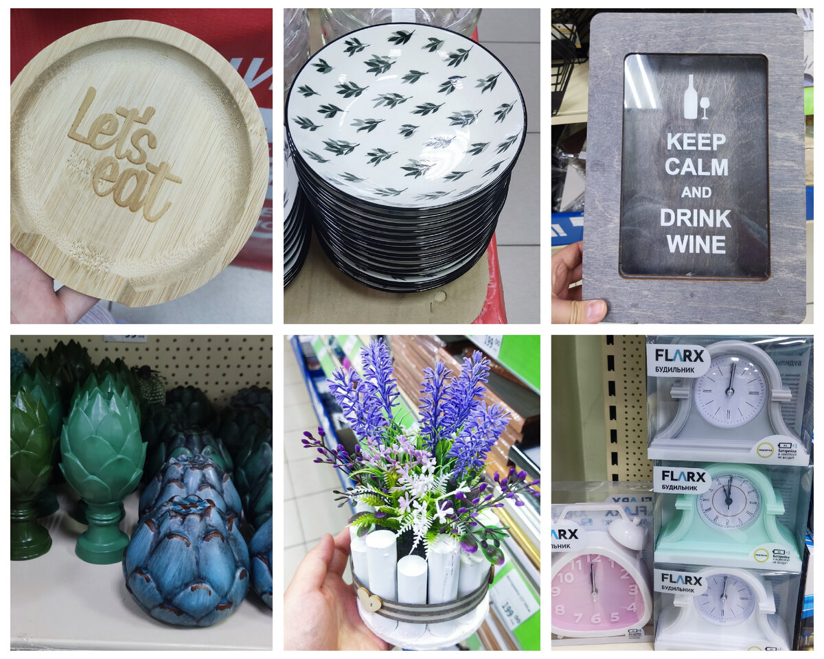 Очень много разной посуды. И причём много ярких и цветных рисунков.