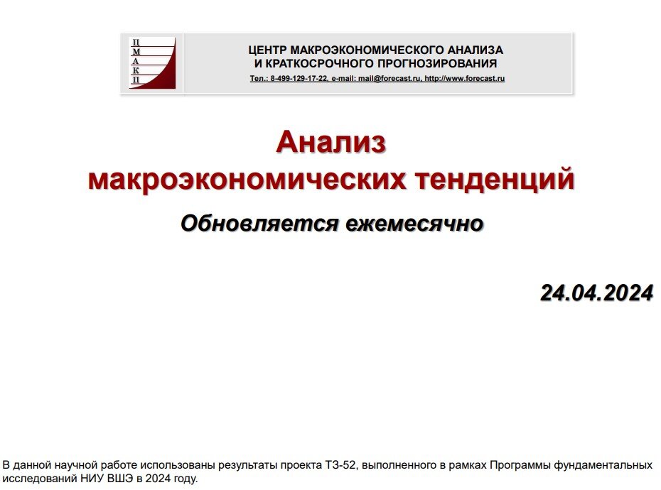 Центр макроэкономического анализа и краткосрочного прогнозирования опубликовал очередной обзор экономической ситуации в России от 24 апреля.