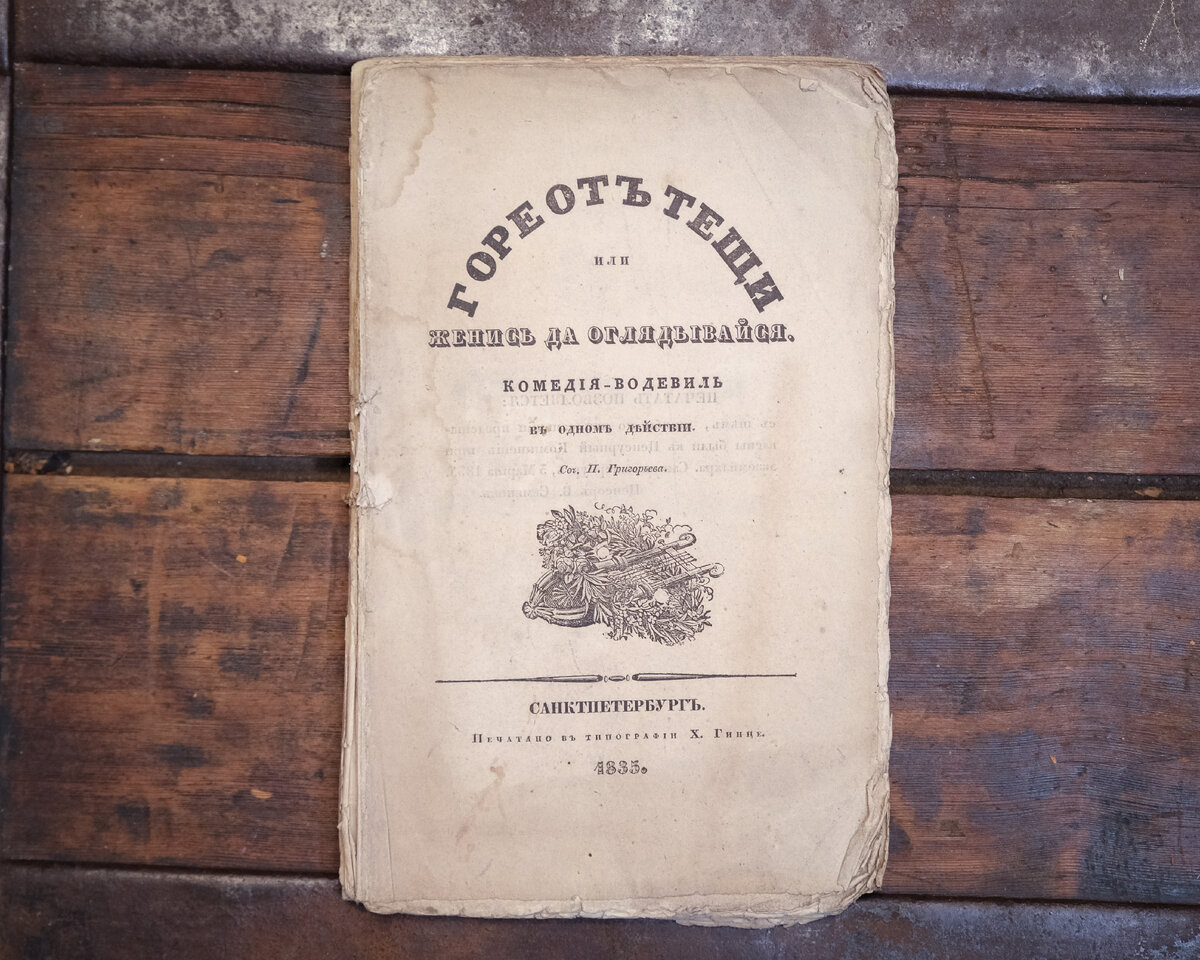 Ах, водевиль, водевиль… Этот жанр зародился в России в начале XIX века как стиль, развивающийся на основе комической оперы. Русские театралы приняли его с огромным восторгом! К нам же на реставрацию попала чудесная книга 1835 года «Горе от тёщи, или женись да оглядывайся!» авторства Петра Ивановича Григорьева. Небольшое издание отчаянно нуждалось в спасении: страницы оторвались от обложки и разлохматились по краям, да и сами листы потемнели. Мы аккуратно промыли каждую страничку и дорастили утраты, появившиеся с течением долгих лет. Теперь блок как новенький, а сама обложка посветлела и приобрела изначальный приятный голубой цвет. Ценное издание обрело вторую жизнь, а мы – огромное удовлетворение от проделанной работы! По своему образованию Пётр Иванович Григорьев был музыкантом. Он поступил в Петербургское Театральное училище по классу виолончель, а затем А.С. Грибоедов и А.А. Шаховский разглядели в юном ученике яркое дарование драматургического актёра. Они уговорили Григорьева перейт