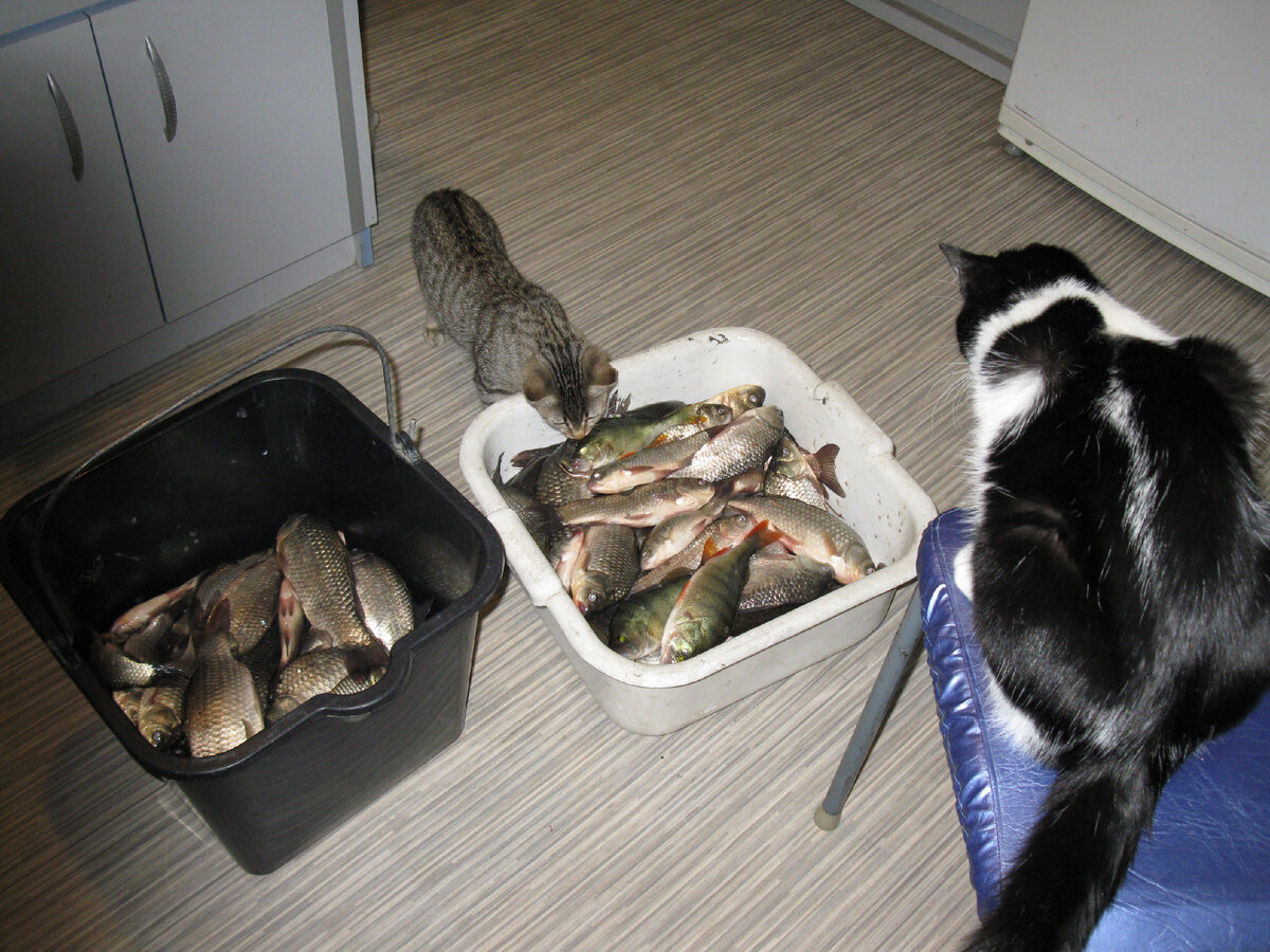 Ну то, что кошки любят рыбу - известно всем. И сколько же кошачьей радости случалось в доме, когда мужчины приходили с хорошим уловом!! Договорились до того, что на следующую рыбалку мы берем эту парочку с собой. Пусть сами попробуют хоть что-нибудь поймать!! Серую британку оставим дома, она к рыбе спокойней относится, да и вряд ли ей понравится на природе... Про то, как полосатый Кузя и его старшая подруга - черно-белая Динка - съездили на рыбалку, и будет следующая история. Всем, кто прочитал - спасибо!