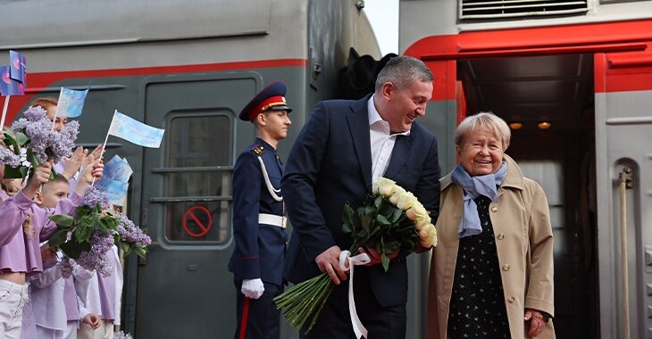 Бочаров с букетом наперевес встретил Александру Пахмутову на вокзале