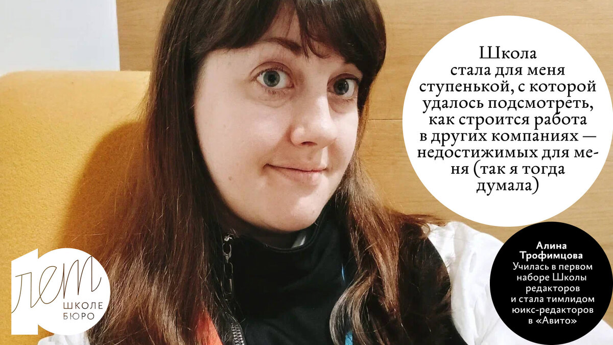 Алина Трофимцова училась в первом наборе Школы редакторов и стала тимлидом юикс‑редакторов в «Авито». «Во‑первых, я хочу вас поздравить — у вас получился очень важный и „градообразующий“ для многих редакторов проект. Во‑вторых, давайте знакомиться! Я Алина Трофимцова, тимлид UX‑редакторов «Авито» и выпускница первой ступени первого выпуска Школы редакторов. Сейчас у меня команда редакторов из 6 человек, свой небольшой ТГ‑канал и самые тёплые воспоминания о том, как это было. Школа стала для меня ступенькой, с которой удалось подсмотреть, как строится работа в других компаниях — недостижимых для меня (так я тогда думала). Я была копирайтером и считала, что моя работа — писать тексты. А работа редактора — писать и редактировать тексты. Занятия по дизайну, юридической грамотности, переговорам я слушала с внутренним сопротивлением и считала, что к редакторской работе они не относятся никак. У меня не получилось сразу принять и использовать информацию, которой со мной щедро делились. Но спу