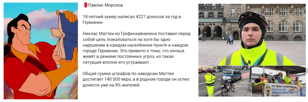 Везде должен быть порядок - это хорошо. Как за ним эффективно следить, государства не в курсе. Есть какие-то решения, но есть желающие их обойти. Поэтому появляются штрафы. Хорошо это или плохо, каждый может судить сам. Но и эти штрафы некоторые обходят. А есть ответственные личности, которым не нравится, что кто-то нарушает законы, и они готовы помочь государству выявить эти личности. А если государство будет платить за такую помощь, то можно это назвать полноценной работой с зарплатой? Например, в Германии появился Павлик Морозов, который помогает своей стране быть образцом законопослушности. Парню всего 18 лет, а у него уже такая важная жизненная цель - в каждый германский город принести порядок. Уже на 4227 раз сделал лучше свою страну. Представляете, каким нужно быть повернутым, чтобы поставить себе цель - в каждом населенном пункте своей страны написать хотя бы один донос. Отважный боец не боится угроз, а продолжает строчить доносы. Думаете, просто так? Нет, конечно. За доносы пл