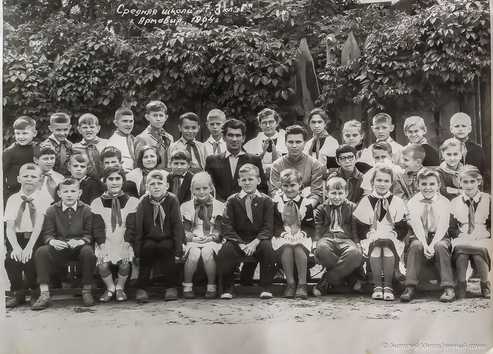 На фото: Армавир, 7-я школа, мой 3-й "Г" класс, в котором я проучился к этому моменту ровно один месяц. Я в центре переднего ряда, слева Светка Барбашевич; справа (через девочку) Женька Елфимов, за его спиной в среднем ряду "ревнивый Отелло" - Вартан; рядом с ним "Борик", половину лица ему закрывает роскошный белый бант первой красавицы класса, отличницы, спортсменки и комсомолки Ольги Слепенчук.