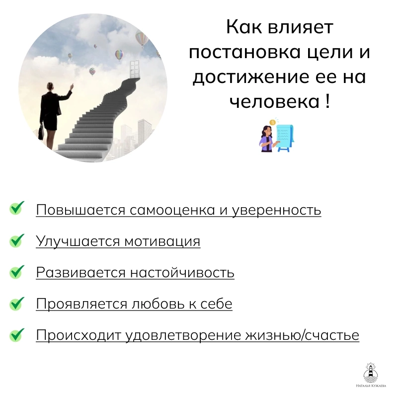 Когда человек ставит цели и достигает их, это может оказать глубокое и положительное влияние на его жизнь: Повышение уверенности в себе: 🏆 Достижение целей дает человеку чувство выполненного долга и повышает его уверенность в своих способностях. Это побуждает его ставить более амбициозные цели и стремиться к большему. Улучшение мотивации: 🚀 Достижение целей мотивирует человека продолжать ставить и достигать новых целей. Он видит, что его усилия приносят плоды, и это вдохновляет его на дальнейшие действия. Развитие настойчивости: 💪 Процесс достижения целей часто сопряжен с трудностями и неудачами. Однако, если человек настойчив и не сдается, он развивает настойчивость и стойкость, которые помогают ему преодолевать будущие препятствия. Увеличение удовлетворенности жизнью: 😊 Достижение целей приносит чувство удовлетворения и счастья. Это дает человеку ощущение цели и направления в жизни. Улучшение общего благополучия: 💆♀ Достижение целей может положительно сказаться н
