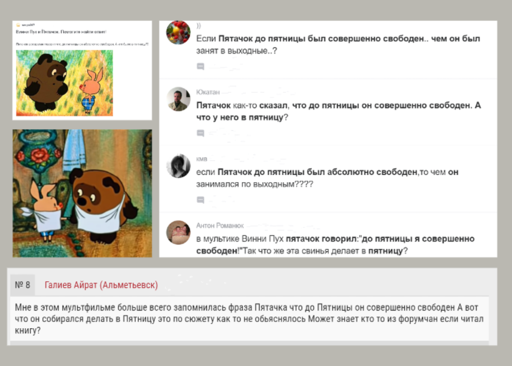 Есть мнение, что взрослым не стоит смотреть детские мультфильмы и сказки - не для них они созданы. Я ж не согласна. По-моему, взрослый взгляд на детские произведения весьма любопытен. И безобиден: взрослые зрители начинают замечать то, что ускользало от них в юном возрасте, это ж нормально. Приведу пример - мультик про Винни Пуха и его компанию (советский, не диснеевский). Я, честно слово, ухихикиваюсь от того, какими вопросами задаются зрелые дяди и тети при пересмотре этого шедевра. Больше всего взрослых зрителей озадачивает в мультике Пятачок - потому что про него я нашла наибольшее количество "а почему?". Он, оказывается, весьма загадочный персонаж. Вопросы собрала с просторов интернета - из комментариев, обзоров и с форумов, посвященных обсуждению кино и мультфильмов. Что же такого запланировано на пятницу? Наверное, это один из самых распространенных вопросов, который цепляет внимание взрослых зрителей при пересмотре мультика. Нашла десятки разных сайтов и форумов, где люди об
