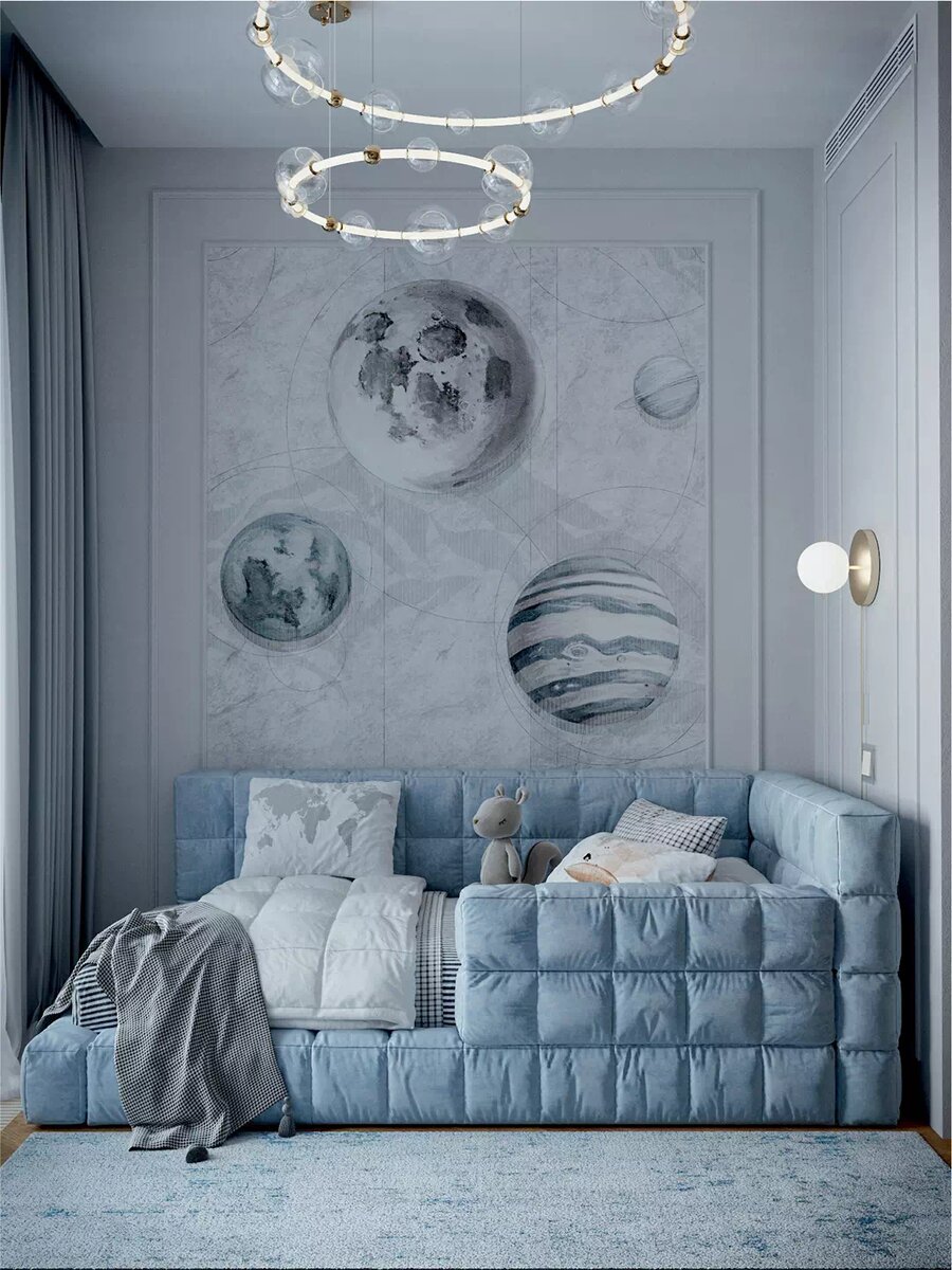 Мебель в детскую комнату маленького мальчика продумана до мелочей, обеспечит ребенку развитие и полноценный отдых. Смотрите детальнее тут Мебель в детской комнате для мальчика смотрится стильно и функционально, поддерживая интересы и развитие двухлетнего ребенка. Гармоничная комбинация синих и серых оттенков создает успокаивающую атмосферу, идеально подходящую для игр и отдыха малыша. Сразу привлекает внимание уютный уголок для отдыха с мягким диванчиком в синем цвете, который приглашает ребенка расслабиться после дня, полного открытий. Плюшевый друг на диване добавляет ощущения комфорта, а настенный светильник обеспечивает мягкий свет для вечерних сказок. Особого внимания заслуживает продуманность расположения мебели в комнате, где каждый предмет легко доступен для ребенка. Стена, украшенная яркими картинами и настенными декорациями, стимулирует развитие воображения, в то время как плавные текстуры и теплые деревянные элементы добавляют комнате домашнего уюта. Эргономичная зона для и