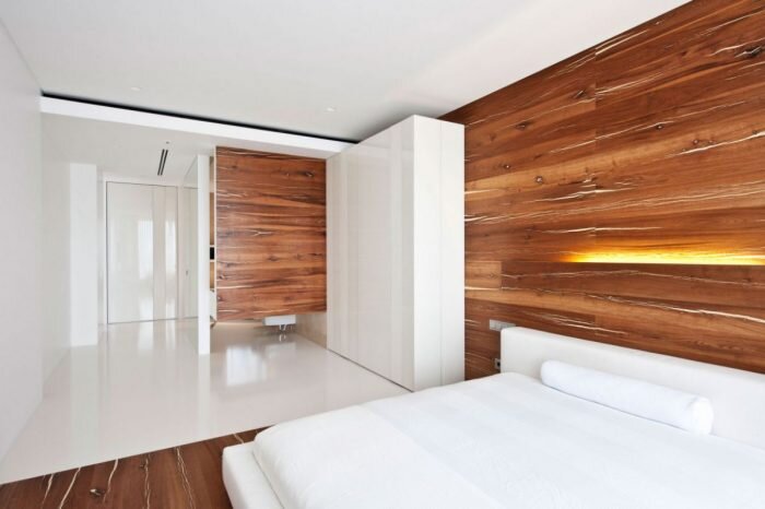 Этот вид напольного материала можно использовать в другом качестве — как отделку для оформления стен. Например, одно из популярных решений — поверхность в спальне, за кроватью.