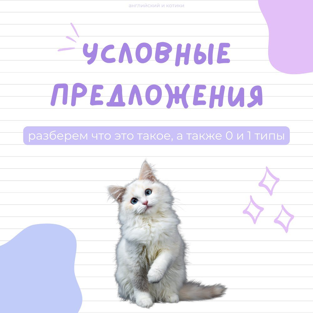 Это был пример условного предложения. Сегодня изучаем важную тему для экзамена и для жизни - условные предложения. Условное предложение состоит из двух частей: главное предложение и придаточное предложение. В главном предложении (main clause) содержится следствие - то, что произойдет, если условие будет выполнено. Придаточное предложение содержит само условие (Если ты будешь делать это...) Про порядок частей в условном предложении смотри в карточке: Типы условных предложений: В телеграме выложили файлик с практикой по данной теме - https://t.me/englishandcats/4165 На этом все! Не забывайте подписываться, чтобы не пропускать новые полезные статьи :)