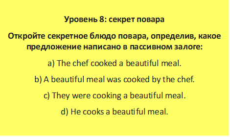 Уровень 8: пассивный залог в английском языке обозначается наличием вспомогательного глагола 'be' в нужном времени и причастия прошедшего времени основного глагола. Правильный ответ – b) A beautiful meal was cooked by the chef.