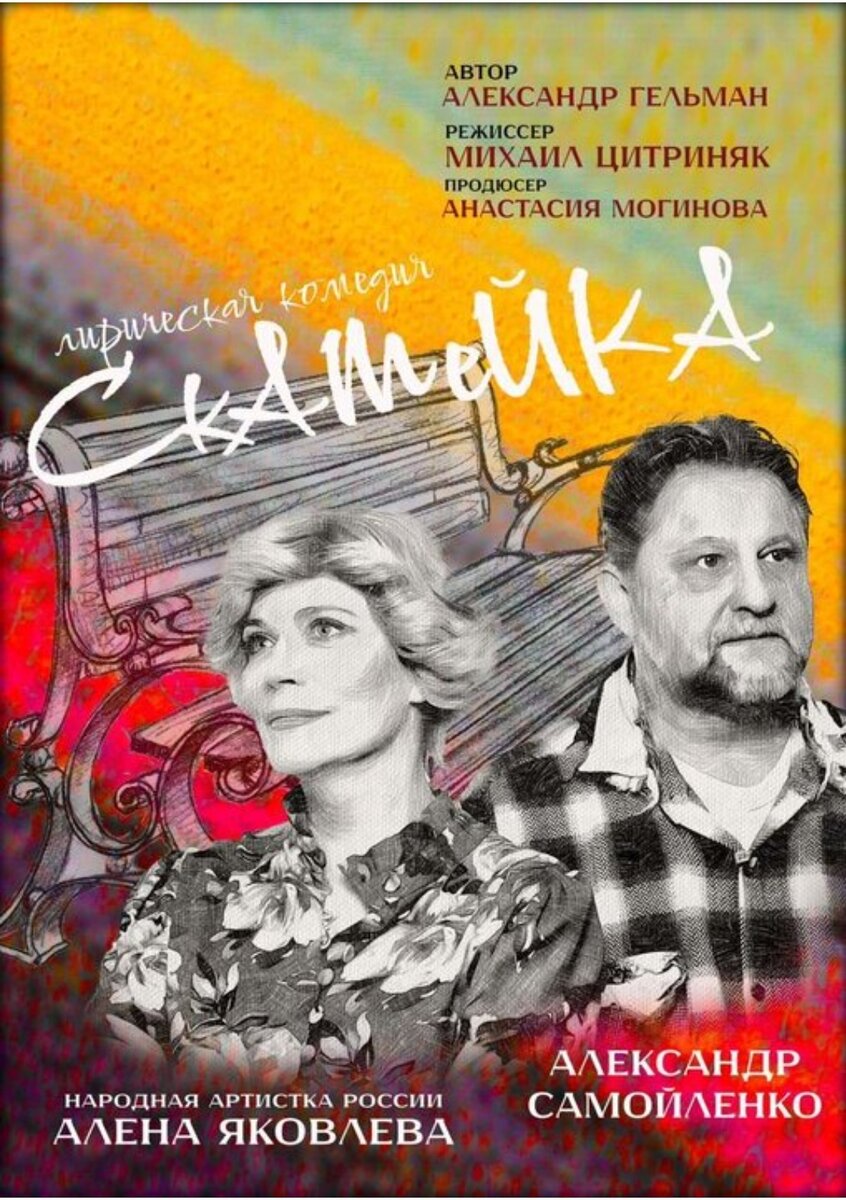 В Продюсерской компании «М‑АРТ», одним из направлений деятельности которой является постановка и прокат спектаклей с участием звёзд театра и кино, не так давно вышел новый спектакль «Скамейка» по пьесе Александра Гельмана С участием Александра Самойленко и народной артистки России Алёны Яковлевой Пьеса «Скамейка» весьма популярна и часто ставится в театре. Текст вобрал в себя самые разные стороны человеческих взаимоотношений. И это не только про отношения мужчины и женщины, хотя на сцене всего двое: он и она. Сквозь реплики главных героев проступают и дети, и родственники, коллеги, соседи. Общество в целом. Как-будто каждая новая ниточка разматывает целый клубок. И это интригует, подкупает и восхищает. Что называется, успевай замечать! Написана пьеса в 1983 г. И для меня спектакль «Скамейка» - это ещё и возможность вернуться в детство, в 80-е, в жизнь моих молодых родителей, ведь герои живут именно там и тогда. Советское время, чулочно-носочная фабрика, автобаза, гастроном, закрываю