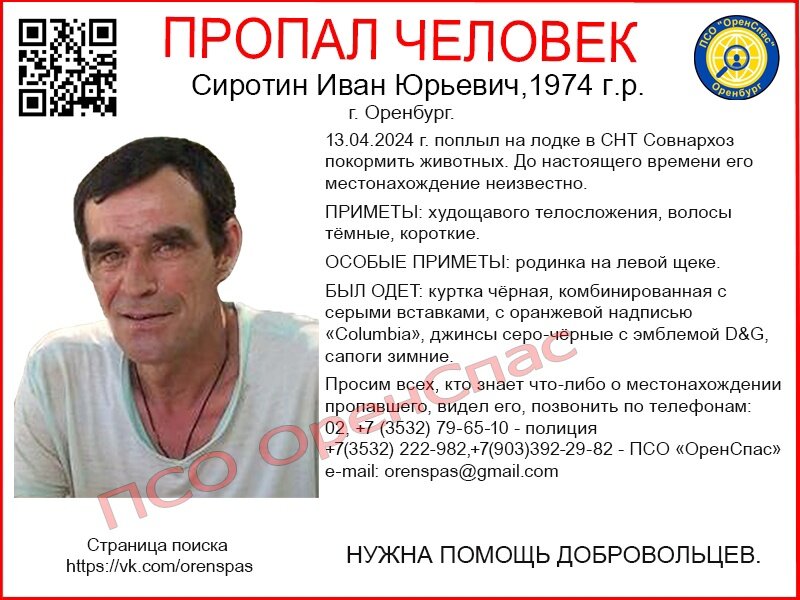 В Оренбургской области сотрудники полиции и волонтёры ПСО «ОренСпас» устанавливают местонахождение Ивана Сиротина. Мужчина 1974 года рождения 13 апреля 2024 года поплыл на лодке в СНТ Совнархоз покормить животных и пропал. Телефон оренбуржца находится вне зоны доступа. До настоящего времени местонахождение Ивана Сиротина неизвестно. Поисковики «ОренСпаса» провели несколько выездов с лодками на местность, но обнаружить пропавшего им не удалось. Его лодку они также не нашли. Сегодня поисковая операция на воде продолжается. Волонтёры планируют осмотреть затопленную территорию СНТ на лодке и при помощи квадракоптера. Приметы: худощавого телосложения, волосы тёмные, короткие. Особые приметы: родинка на левой щеке. Был одет: куртка чёрная, комбинированная с серыми вставками, с оранжевой надписью «Columbia», джинсы серо-чёрные с эмблемой D&G, сапоги зимние. Всех, кто видел Ивана Сиротина или что-либо знает о его местонахождении, просят позвонить по телефонам: 02, +7 (3532) 79-65-10 — полиция,