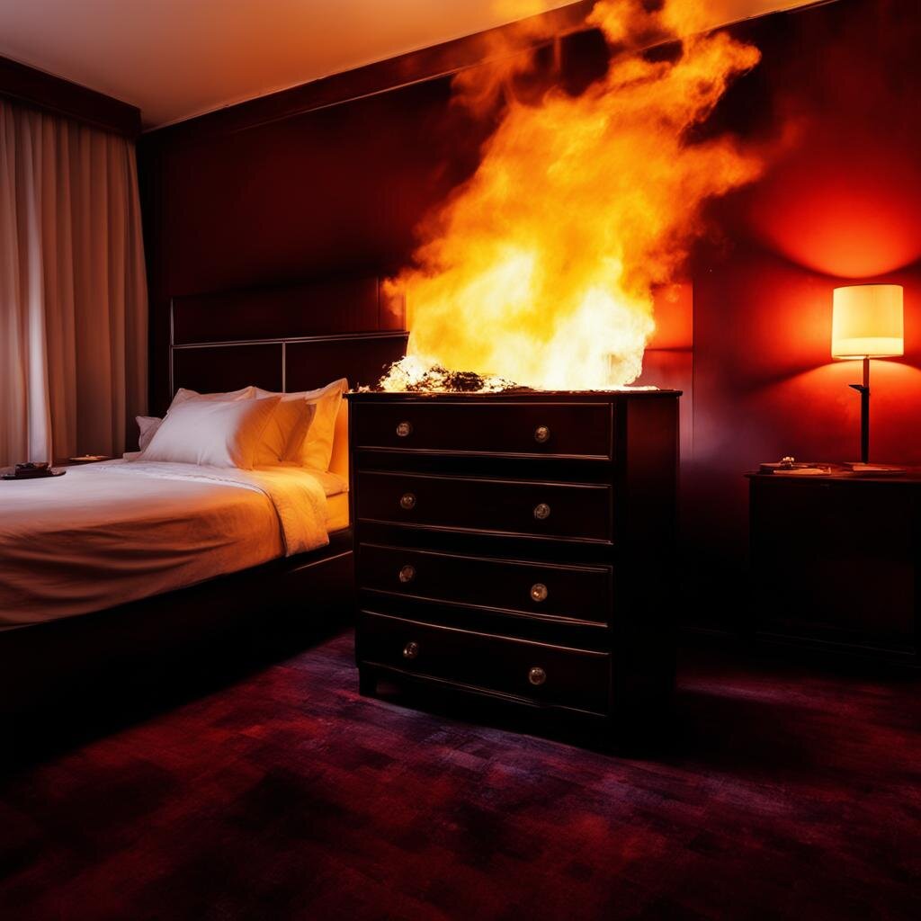 Тепловой взрыв внутри деревянного ящика вместе с телевизором просто поджёг всю эту конструкцию, и она стояла, одинокая, посередине номера, и полыхала, объятая пламенем. Датчики пожара в номере были отключены, и датчики в коридоре сработали только через некоторое время, когда дым пошёл снизу двери. Дежурная смена инженеров прибежала, зафиксировала пожар, и в 4:40 толпа сотрудников бегала по коридорам с огнетушителями - при этом, стараясь не шуметь))) ведь гости спят))). В самом же номере они устраивали натуральное пенное шоу.