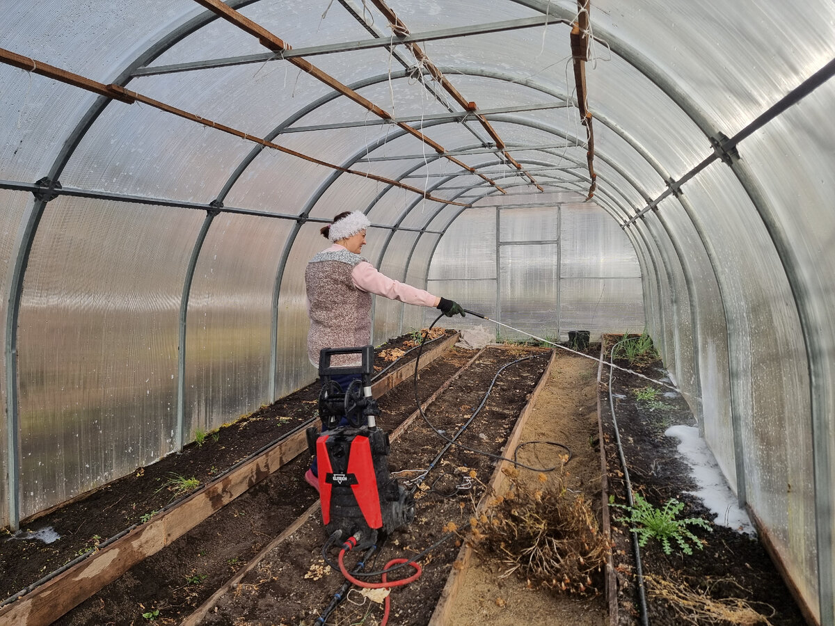 Теплица в огороде - дело хорошее, особенно в зонах рискованного земледелия, как у нас на Урале😂 Но её тоже нужно готовить к посевам. У каждого огородника свой подход. Кто-то еще с осени все готовит. Я же никогда осенью не успеваю🤷♀️ Поэтому мое время - весна. У нас на участке 3 поликарбонатные теплицы. Одна 12 метров и 2 по 8. И каждая весна у меня начинается с того, что я выпалываю своих заросших красавиц😂 А затем мою с хозяйственным мылом. Беру самое обычное жидкое хозяйственное. Для удобства и быстро в процесса использую мойку высокого давления. А в этом году еще попробовали на ней специальную насадку - пеногенератор. Отличная штука, скажу я Вам👍 Сначала все покрываешь хорошим слоем пены, а затем просто срываешь водой. Нет мойки - не беда. Можно аккуратно помыть при помощи швабры или попа и ведра. Получается прилично дольше, но точно не хуже. Главное не использовать йод. Очень часто его рекомендуют для обеззараживания теплиц, но только не поликарбонатных. Если у Вас пленочное и