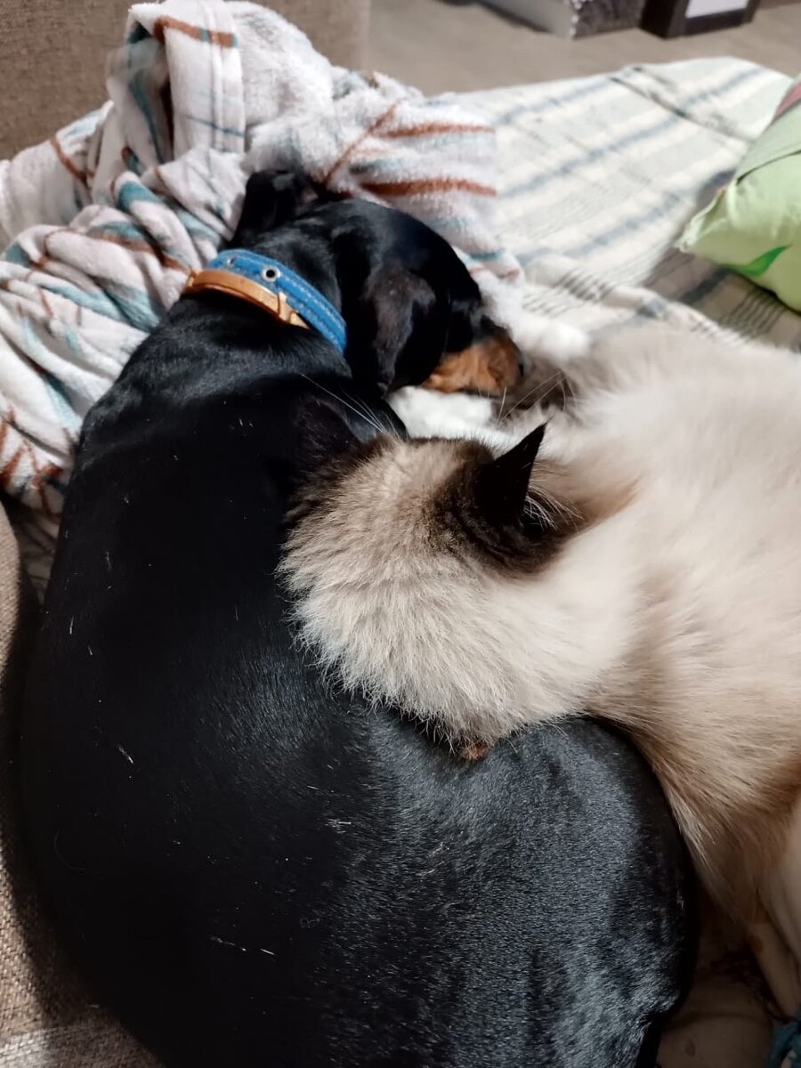 «Живёт Сарделька хорошо. Регулярно осматриваем. У неё пищевая аллергия, поэтому корм премиум, гиппоалергенный. Это кошка, они любят друг друга и часто играют. А кот держит дистанцию, она его любит погонять на улице😃Но дома спят все в куче иногда. Прижилась легко, она очень добрая, совершенно не агрессивная. Скучает страшно, радуется приходу аж писается😃 Ещё видно, что обучена