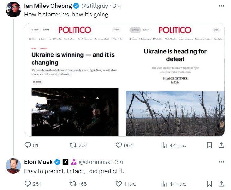 Маск оставил комментарий под постом одного из пользователей соцсети X, который выложил заголовки Politico разных периодов об украинском конфликте. Если раньше издание писало, что "Украина побеждает", то теперь — "Украина движется к поражению". В статье Politico говорится, что на фоне острого дефицита боеприпасов в ВСУ линия фронта может рухнуть уже этим летом. "Если ситуация не изменится, Украина в её нынешнем виде останется в прошлом", пишет издание.