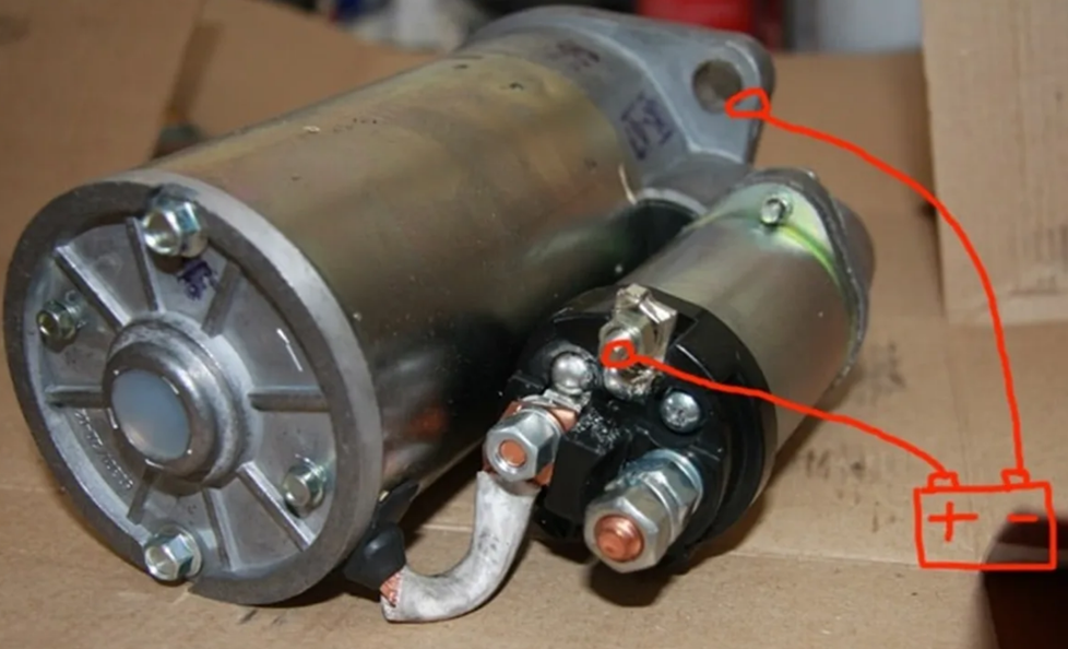 Не спешите выкидывать стартер, его надо проверить. Что нам понадобится для контроля стартера? Во-первых, аккумуляторная батарея. Потом, нужно проверить стартер. Бывает, что втягивающее реле не работает. Поэтому, дело может быть именно в нем, а не в стартере. Поэтому, расскажем, как, не имея втягивающего устройства, узнать работоспособность стартера.