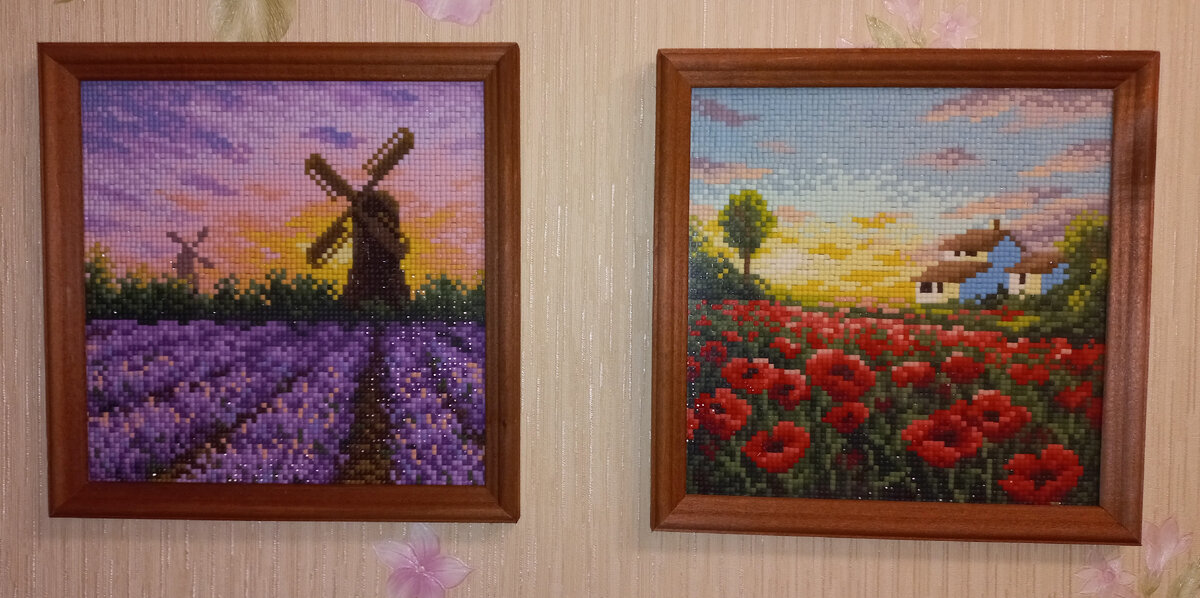 Дочка очень любит собирать картины из алмазной мозаики. Это её очередные работы. Наконец их то повесили на стену.