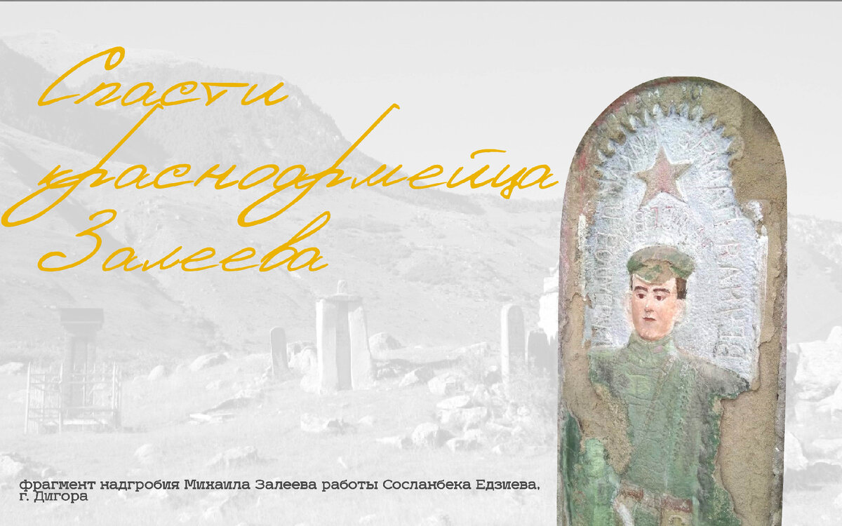 Работа кипела, электропила расчищала дикие заросли, ведь в эту часть кладбища уже никто давно не ходил. Время неумолимо и не осталось никого, кто бы помнил о тех, чьи тела давно приняла земля, и о существовании которых говорили только надгробия. Когда умолкла пила, все увидели, что на надгробии запечатлен не убеленный сединами старец, а молодой красивый юноша в форме красноармейца. Благодаря сохраненной высеченной надписи было установлено имя – это был Михаил Залеев. Всматриваясь в лицо молодого парня в командирской шинели, невольно возникали вопросы кто же он, почему он так рано ушел из жизни, и почему же Едзиев взялся увековечить этого человека. Так начались поиски информации о красноармейце.