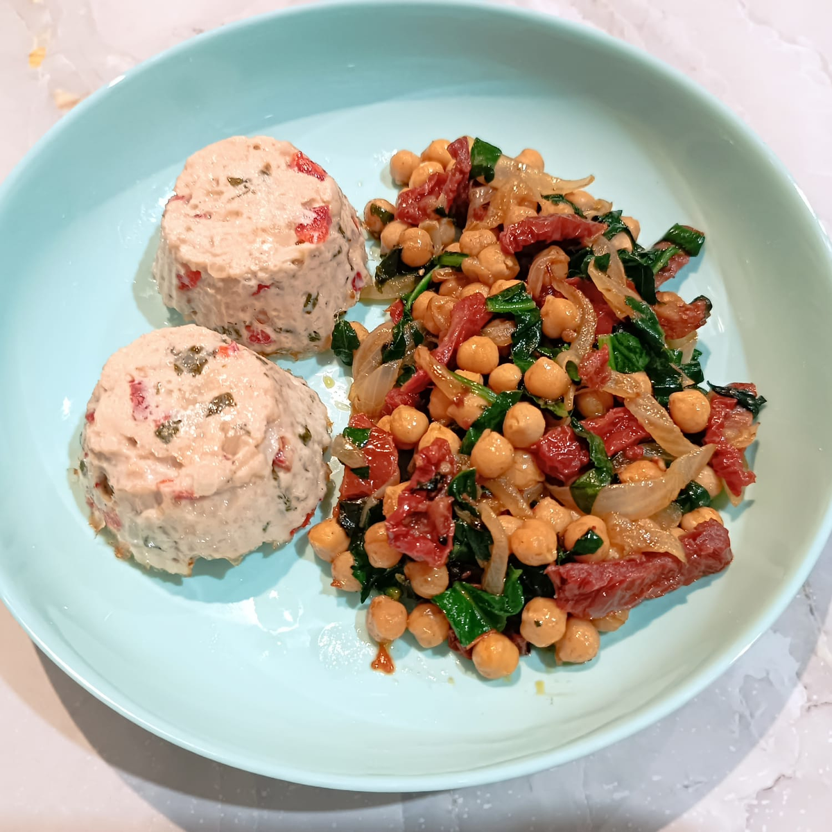 Гарнируем. У меня нут со шпинатом и вялеными помидорами.