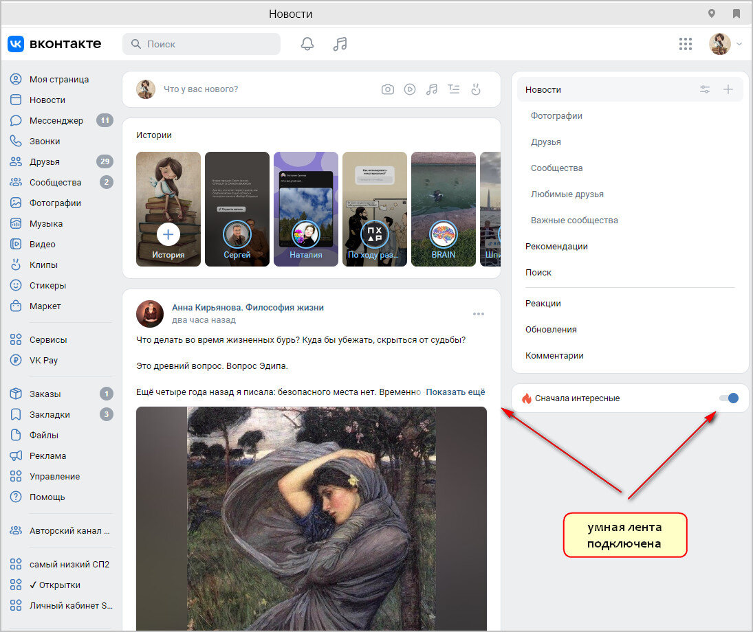 3. В правом меню обратите внимание на опцию Сначала интересные. Она как раз и отвечает за формирование "умной ленты". По умолчанию - подключена.