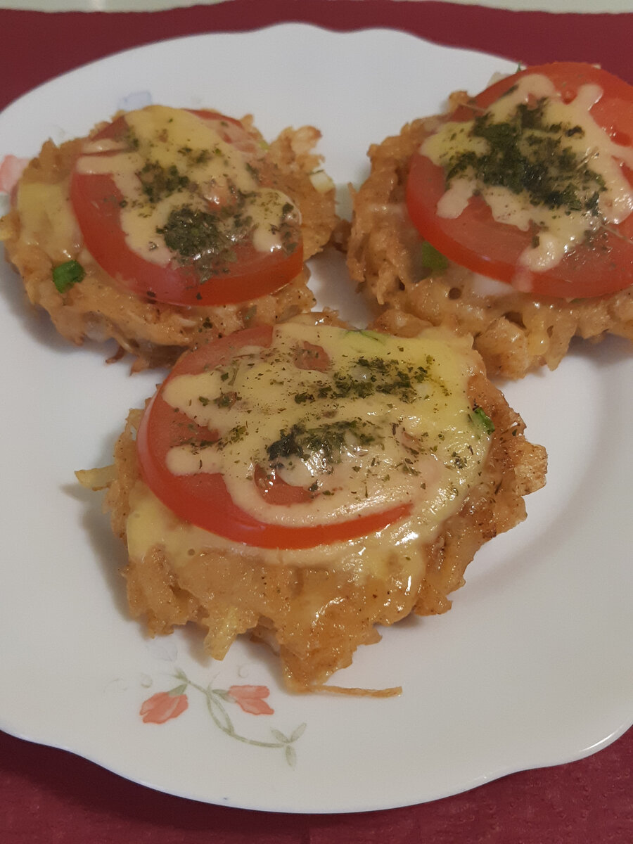 Среди бесчисленного множества блюд из картофеля драники занимают особое место ввиду широкой известности и простоты приготовления. Мы приготовим их не по классическому рецепту. Состав: Приготовление: Картофель натереть на крупной тёрке, залить холодной водой на 5 минут. Тем временем готовим остальные ингредиенты. Репчатый лук мелко нарезать. Сыр натереть на крупной тёрке. Помидоры нарезать кружочками. Зелёный лук нарезать. Картофель откинуть на дуршлаг, и отжать воду. К картофелю добавляем яйцо, лук репчатый, соль, паприку, муку. Перемешиваем и жарим на сковороде, как классические драники. При выкладывании вилочкой поправляем края, чтобы картофель не торчал. НО!! Когда переворачиваем, сверху, на каждый драник выкладываем немного сыра и зелёного лука. Накрываем помидором, солим. На помидор кладём сыр и немного мяты. Так с каждым драником. Накрываем крышкой и жарим на небольшом огне до расплавления сыра. Готово. С этого количества продуктов получилось 10 штук, в два захода. Прия