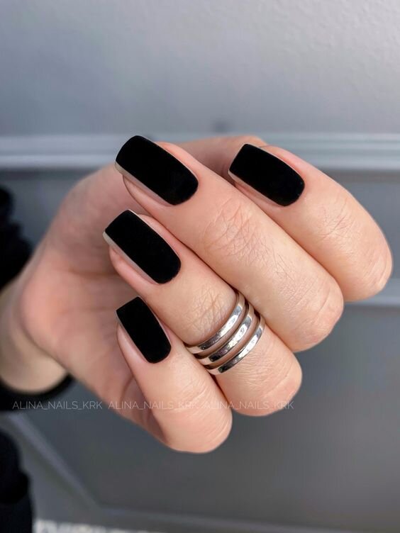 Короткие аккуратные ногти в сочетании с черным гель-лаком или базой подчеркнет ваш стиль и элегантность. Поверх черного лака можете нанести глянцевый или матовый топ, в зависимости от вашего предпочтения и выбранного дизайна.