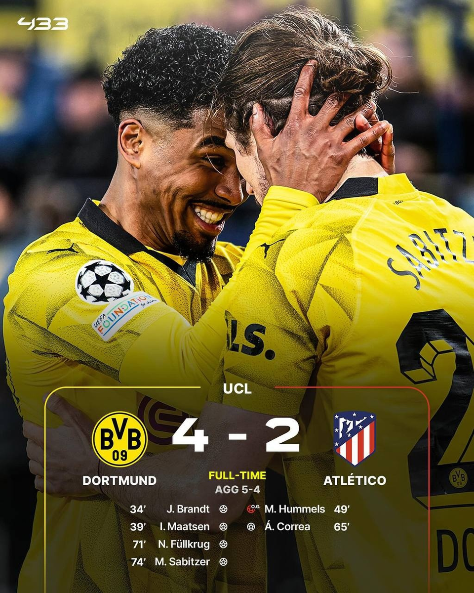 В ответном матче Боруссия забила в ворота Атлетико 4 мяча и вышла в полуфинал, взяв реванш за поражение (4:2).