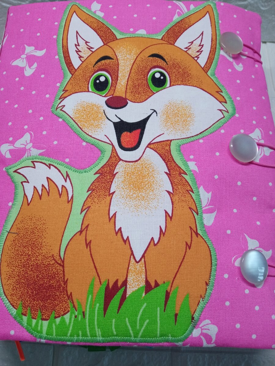 Очередная книжка, сшитая на заказ. На обложке милейшая лисичка. Закрывается на резинку и пуговицы. На этой страничке учимся продевать шнурок через люверсы. И шнуровка через колечки. Здесь учим цвета, крепим на липучки и продеваем в кольца шнурок. Находим детёнышей, фишки крепятся на липучку. На этой страничке дергалки за пуговицы, а у Улитки цветные пайетки, проводим ладошкой и меняем цвет. Учим цвета радуги, продеваем бусинки через колечко. Изучаем большой-средний-маленький с божьими коровками. За радугой прячется очаровательная пчелка. Улитка прячет пуговку- двигаем ее и тренируем четкость движения пальцев.