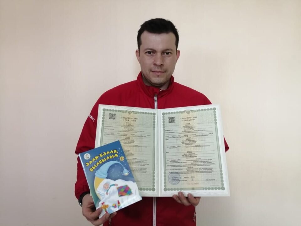 Родителей поздравили с двойной радостью и вручили отцу первые госдокументы детей.