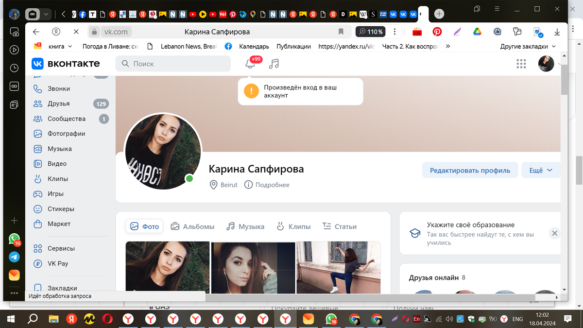 Они мне сегодня взломали вконтакт. Поменяли ФИО и аватару, навешали фото какой-то дуры. Выглядело так. Дело было в восьмом часу утра. Я спала еще. Причем, выглядело похожим на то, как оно меняет ники тут. Явно отвечают Анхар, но с ними не она переписывается, гы. Ну, уже по этому взлому понятно, что это действительно школота. По тем страницам, на которые они меня понаподписали. Пришлось потратить целых три минуты на восстановление доступа и уборку. Я этим сайтом не пользуюсь. Я там только с дочкой в мессенджере переписываюсь. Там она и такие же мелковозрастные тусуются. Вот, почему я сейчас, как проснулась (а спала почти до 12) не отвечала на комменты. Уж простите. А сейчас света нет, бесперебойник сейчас заорет и отключится. Котенку стало хуже. Сейчас жду соседа ехать по делам в Бейрут, возьму с собой. Может, реанимируют. Все, заорал. Сейчас вырубится.
