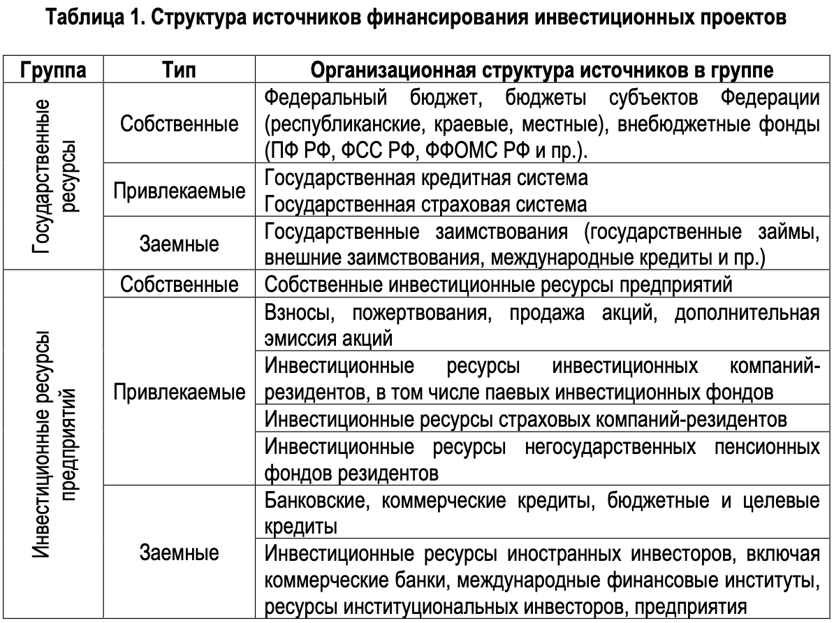 Исходя из государственных и корпоративных источников финансирования инвестиций, определена следующая структура источников финансирования инвестиционных проектов (табл. 1).