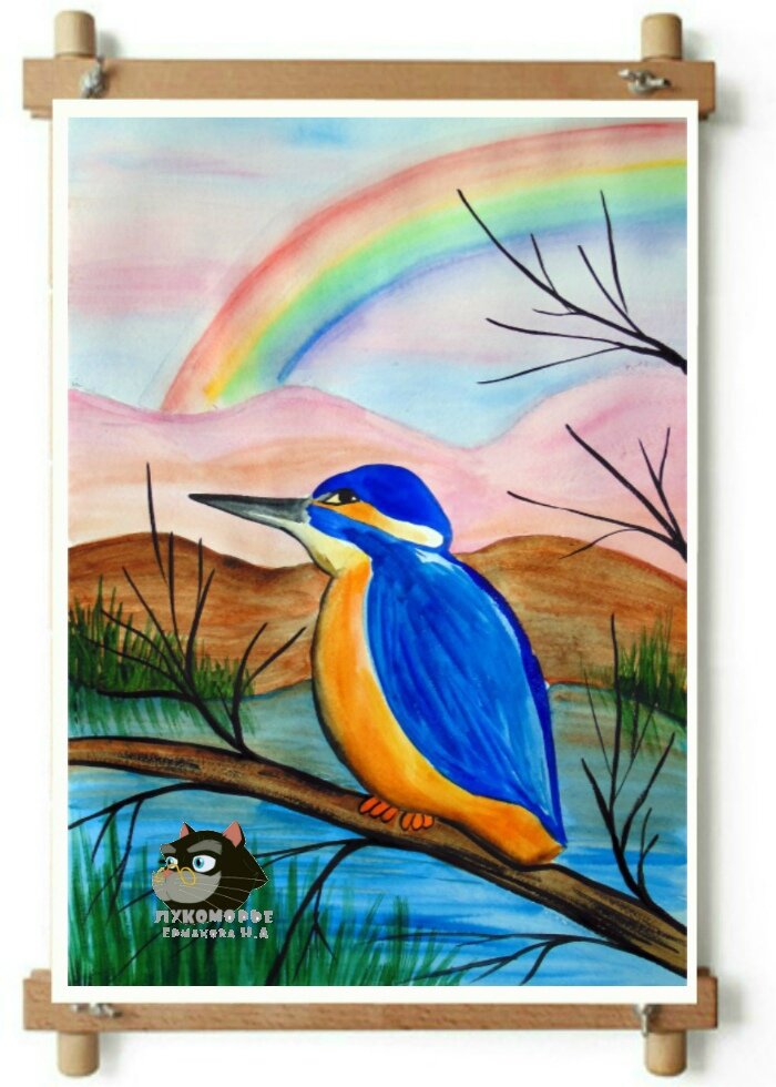 Начинаем работу с предварительного наброска простым карандашом. Сначала делим лист пополам с помощью вспомогательной линии (находим середину листа), затем по её центру в нижней части рисуем овал (туловище зимородка), и ещё один овал немного смещённый в сторону (крыло-в перевёрнутом виде рисунок напоминает крылья пчелы). Над овалами рисуем полуокруглую линию головы птицы. К линии разделяющей лист пополам пририсовываем вторую линию (образуя узкий треугольник)-это клюв. Рисуем глазик, хвост, стираем вспомогательные линии и силуэт птицы готов. Далее строим пейзаж: рисуем три извивающиеся как змейка линии (холмы), под птицей две линии ветки дерева, и в самом верху рисунка первую дугу радуги. Так как мы будем работать акварелью, то карандашный набросок должен быть еле заметным, при необходимости можно воспользоваться ластиком. Перед работай красками акварель нео