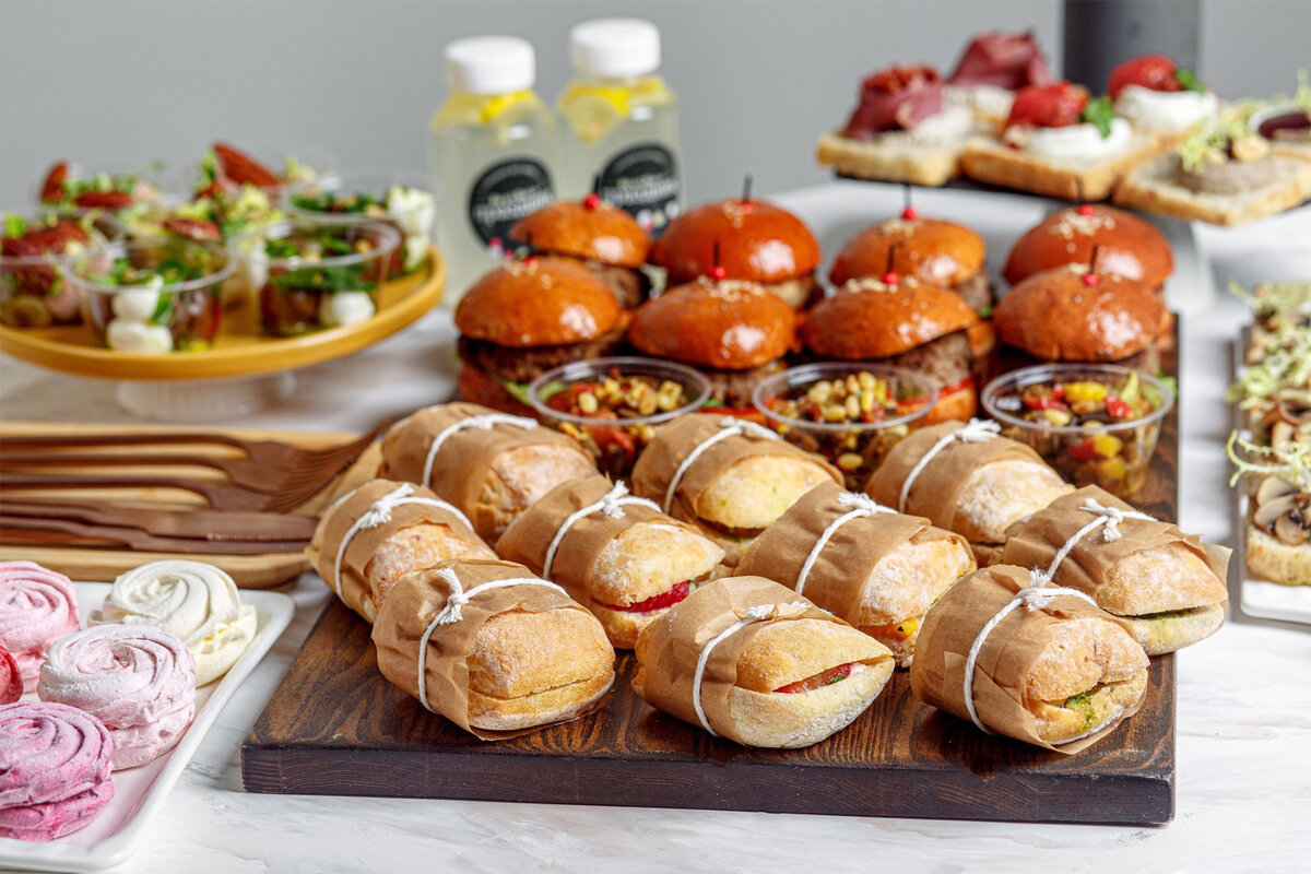 В топ позиций по заказам на фуршет вошли круассан-сэндвичи, фуршетные эклеры с сытной начинкой, ассорти мини-бургеров, салат «Цезарь с курицей» в фуршетных стаканчиках и мини-тарталетки с ягодами.