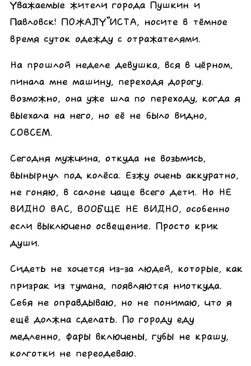 Появился вчера в группе нашего города вот такой пост - я бы сказала призыв. Вполне адекватная просьба. Без наездов и оскорблений. Что тут началось! Самое ужасное, что каждого из таких комментаторов "пролайкали" ещё несколько человек. Были комментарии и более развернутые: Больше всего мне нравится, что многие уверены в том, что только водитель несёт ответственность на дороге. У пешеходов есть права, а у водителей их что, нет? Вот этот комментарий меня вообще убил. Я не выдержала и ответила. На что дама спросила серьезно ли я считаю, что теперь нужно увешиваться светоотражайками. Вот скажите мне, что значит "адекватный водитель"? Мы однажды с мужем ехали вечером по городу. Ограничение там 40 км/ч, много поворотов, поэтому ехали медленно. И вдруг в свете фар мелькает светоотражайка. Муж бьёт по тормозам (хорошо ехали медленно) и оказалось, что дорогу на закрытом повороте в полной темноте переходит семья из пяти (!!!) человек: с детьми, с коляской. И только у одного ребенка, слава Богу,