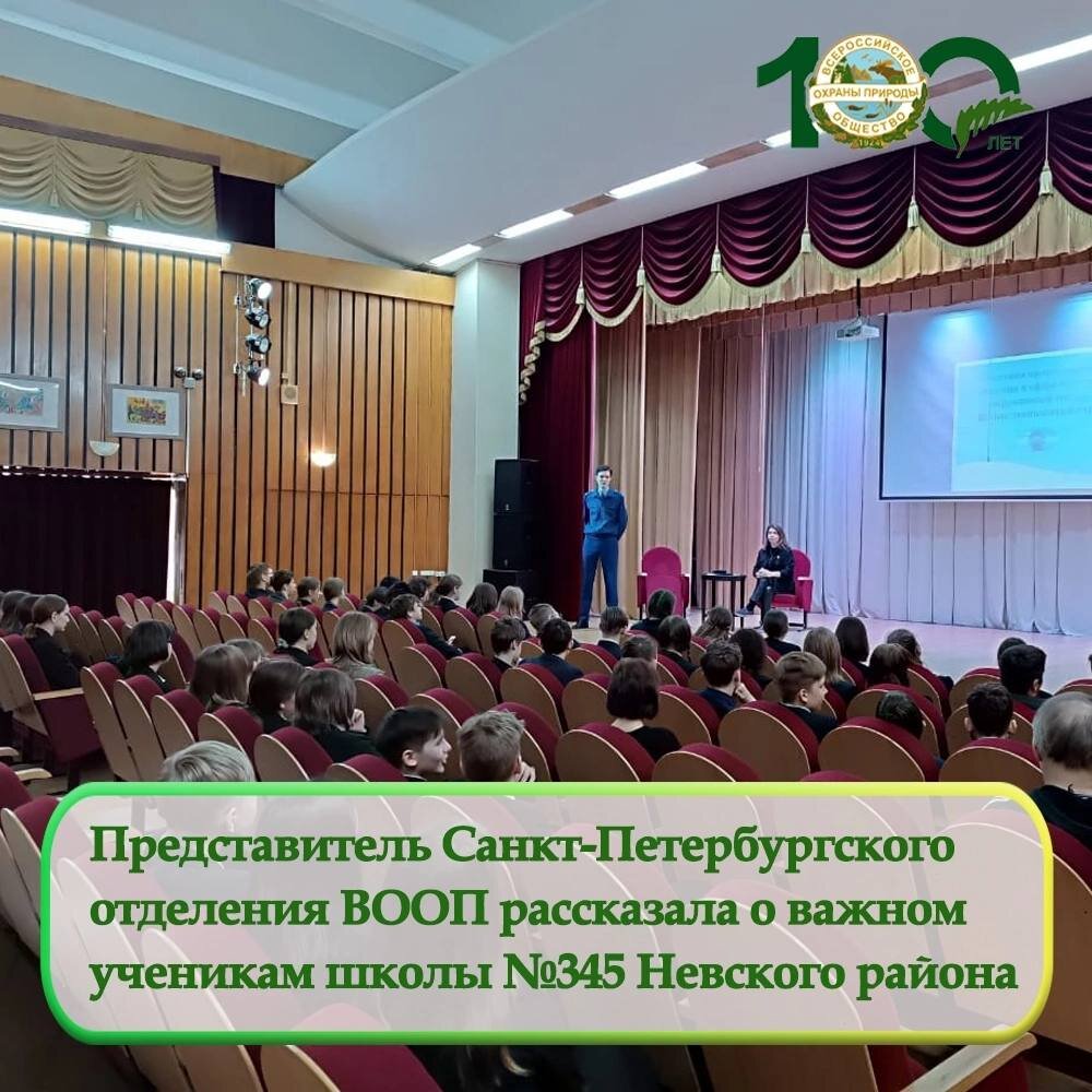 Менеджер проектов Ленинградского областного и Санкт-Петербургского городского отделений Всероссийского общества охраны природы (ВООП) Лада Вольфсон и представитель природоохранной прокуратуры Санкт-Петербурга провели экологический урок в Средней общеобразовательной школе №345 Невского района. Мероприятие объединило ребят средних и старших классов.