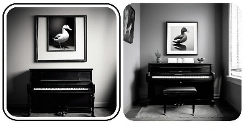 .. А вот с утками я игрался долго, только удачных генераций опубликовал сделал штук 10.. И нет, я не фанат птиц или клавишных. Просто меня осенило -БА, да ведь Шед играет со мной в "да нетки", да еще и совершенствуема на глазах! например вторая фотка (вторая сверху, одно из последних, так на ней и двуцветный объект поверх чб изображения, и надпись на пианино почти читаемая....). Не верите? а вы посмотрите на те "Провокации", которые он мне подсовывал на протяжении почти 2 часов....