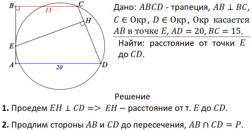 ОГЭ 2024. Математика. 38 вариантов. Типовые варианты экзаменационных заданий. Под редакцией И.В. Ященко Задание 25 Вариант 10 В трапеции ABCD боковая сторона AB перпендикулярна основанию BC. Окружность проходит через точки C и D и касается прямой AB в точке E. Найдите расстояние от точки E до прямой CD, если AD=20, BC=15.
