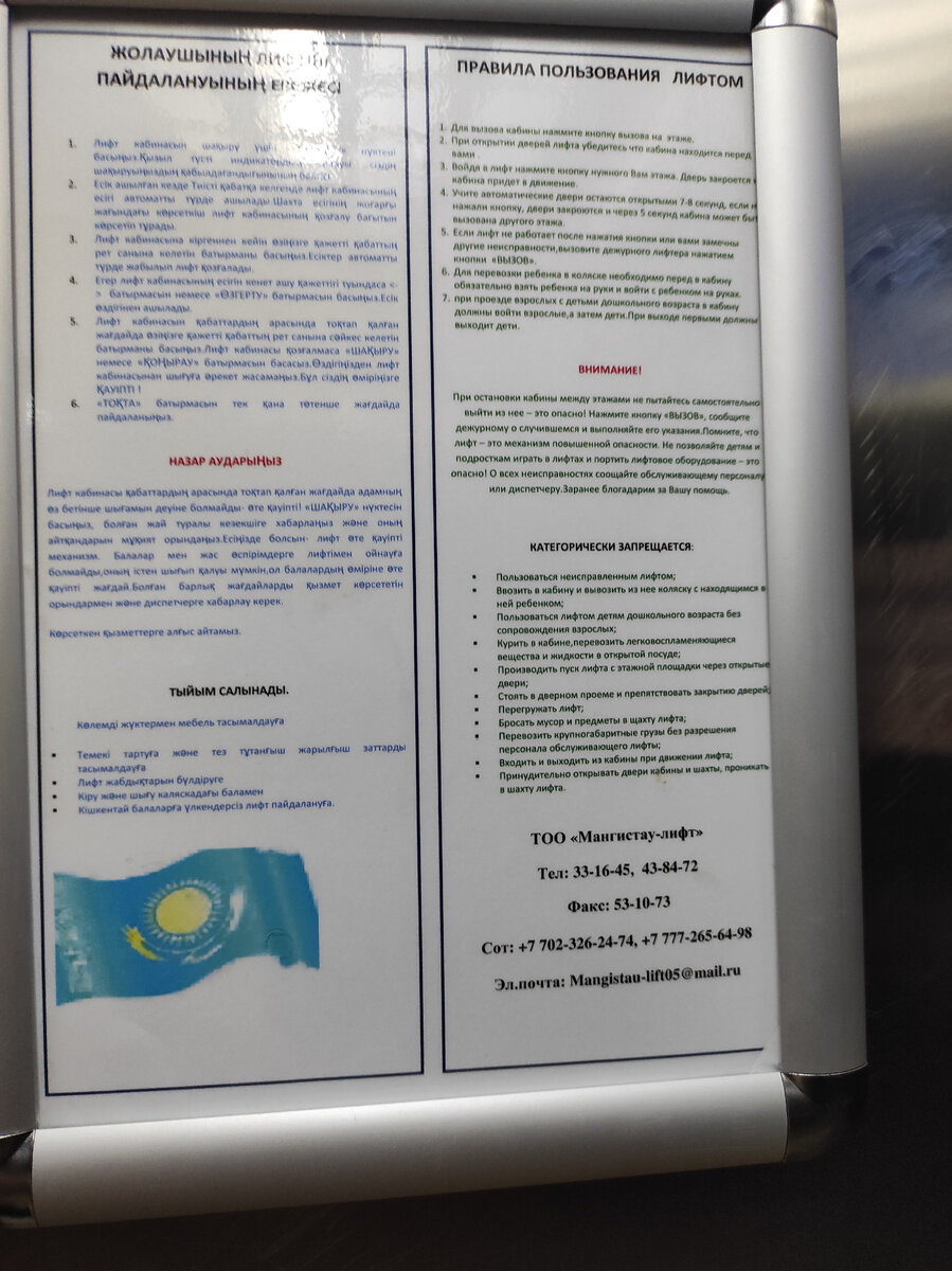В лифте заметил забавную штуку – список правил поведения в лифте. Как и в Казани тут всё на 2х языках – русском и казахском (почти татарский). Но что интересно, список запретов на русском языке существенно больше! Дискриминация! Казахам наверное разрешается пользоваться неисправным лифтом и проникать в шахту лифта) На лекциях рассказывал про динамическую интерпретацию. Всем интересно, как это работает. В перерыве рассказал сказку про Шурале – распространяю татарскую культуру! Некоторые из слушателей были ранее на обучении Шлюмберже. Но я то лучше рассказываю!) В обед поднялась настоящая пыльная буря. Ощущение, что на тебя направили огромный фен. С пылью. Резкие порывы ветра чуть не сносят меня. А каково маленьким детям? А девушкам с прическами? Местные говорят, что зимой тут тоже самое с ветром. Только -10 градусов. Похоже Актау не попадает в список городов, где я хотел