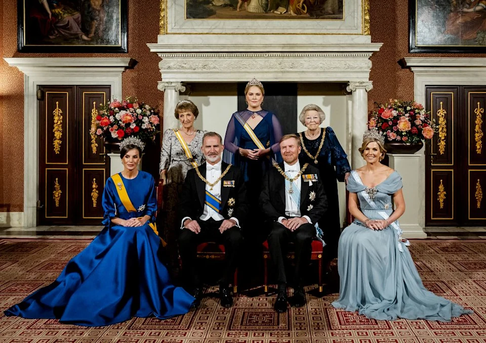 На фото в первом ряду правящие пары Испании - король Фелипе и королева Летисия, и Нидерландов - король Виллем-Александр и королева Максима, во втором ряду наследница престола принцесса Катарина Амалия, бывшая королева Беатрикс, которая отреклась от престола в пользу сына, а также принцесса Маргерит, тетя короля Виллема-Александра.