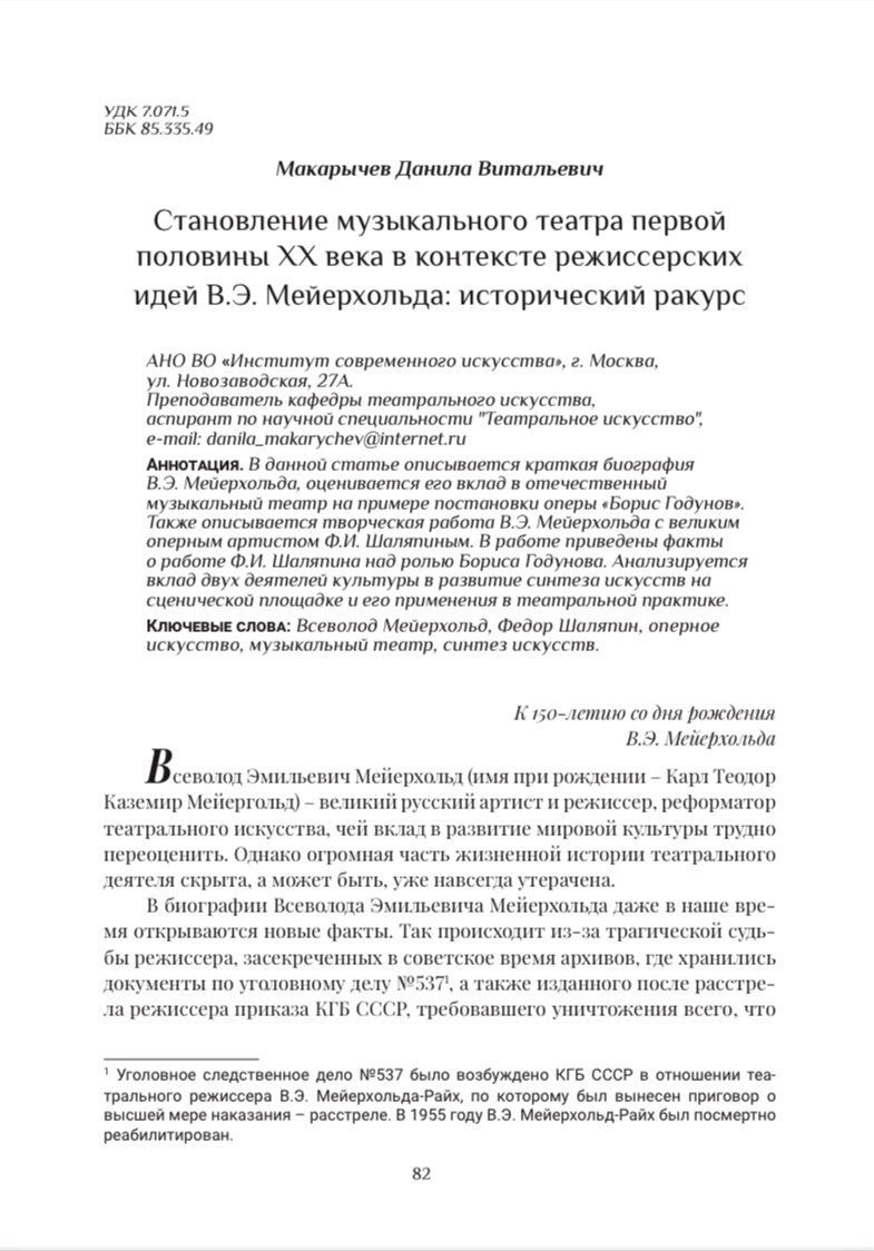 Статья из сборника материалов Всероссийской научно-практической конференции (с международным участием) «Академическое пение сегодня: традиции и перспективы» Для цитирования: Макарычев Д.В. Становление музыкального театра первой половины ХХ века в контексте режиссерских идей В.Э. Мейерхольда: исторический ракурс / Д.В. Макарычев // Сборник материалов Всероссийской конференции (с международным участием) «Академическое пение сегодня: традиции и перспективы» (18 апреля 2024 года, г. Москва). – М.: Институт современного искусства, 2024. С. 82–87. Сведения об авторе: Макарычев Данила Витальевич, преподаватель кафедры театрального искусства, заместитель руководителя департамента реализации молодежной политики и проектов, аспирант по научной специальности 5.10.3 Виды искусства (Театральное искусство) Института современного искусства. Научный руководитель: кандидат искусствоведения Анестратенко Михаил Владимирович. danila_makarychev@internet.ru ; ORCID: 0009-0003-5049-1522