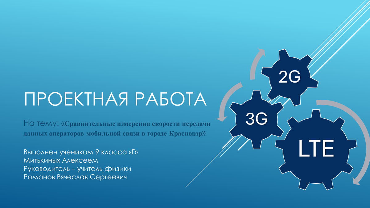Здравствуйте, уважаемые читатели. Меня зовут Митькиных Алексей, я являюсь учеником 9 класса МБОУ СОШ №78. Вашему вниманию представляется исследовательская работа по теме: Сравнительные измерения скорости передачи данных операторов мобильной связи в городе Краснодар. Актуальность данной темы продиктована тем, что не все люди понимают как устроена мобильная сотовая связь, и потому не всегда способны получать максимальное-возможное качество сервисов, в частности, сервис Передачи Данных. Исходя из этого, в данной работе ставится цель: провести измерения скорости передачи данных операторов мобильной связи в пределах города Краснодар и выявить условия влияющие на скорость передачи данных. Для её достижения было необходимо решение следующих задач: 1. Провести библиографический обзор по теме исследования и на его основе определить основные параметры и условия реализации мобильных сетей в городе Краснодар; 2. На его основе разработать план исследований и провести измерения скорости передачи д