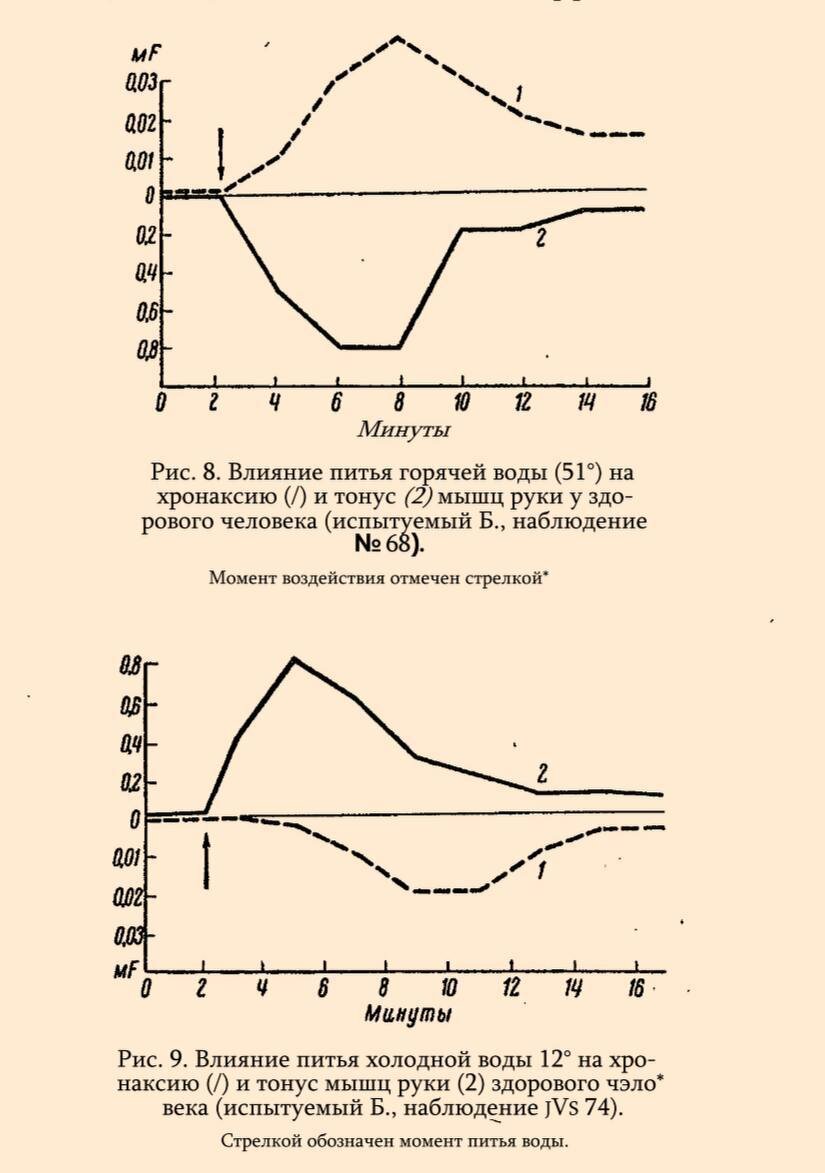 Влияние попадания в желудок горячей и холодной воды на тонус и быстроту реакции мышц рук. (М.Р. Могендович, 1957) ☕️При попадании в желудок горячей воды тонус и быстродействие мышц уменьшается на 10 минут. 🥤При попадании холодной воды - тонус и быстродействие ПОВЫШАЕТСЯ на 10 минут. Выводы: 1. Если хотим расслабиться и отдохнуть, пьем горячий чай. И теперь не удивляемся, почему после горячего чая чувствуем слабость в мышцах. 2. Чтобы взбодриться и тонизировать мышцы (например перед подходом на тренировке) стоит пить холодную воду, а не тёплую/горячую Более подробная информация - в моем телеграм-канале. Ссылка в описании профиля!