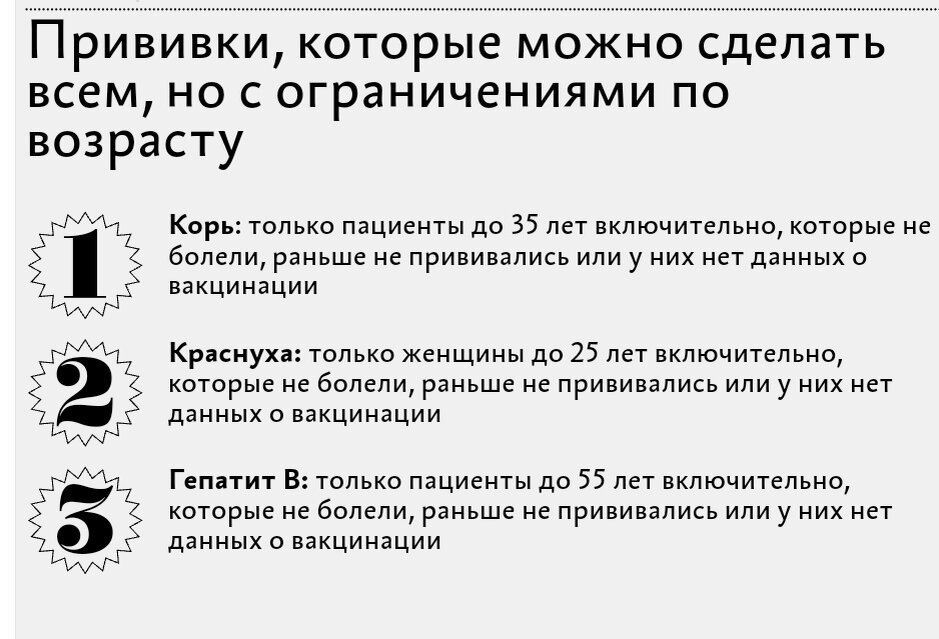 В России бесплатно можно привиться только от дифтерии и столбняка 1 раз в 10 лет, а также от гриппа - ежегодно. Другие прививки можно сделать только до определенного возраста или тем, кто входит в группу риска. В международных руководствах вакцинацию от самого широкого спектра инфекционных болезней рекомендуют всем, у кого нет противопоказаний. Существует 9 инфекций, прививки от которых необходимо делать взрослым: 1. Корь В 2023 году число заболевших корью в России оказалось в 288 раз больше, чем в 2022 году. Причиной назвали приток мигрантов и дефицит вакцин. В настоящий момент в России есть только отечественные вакцины. Их мало и не во всех государственных учреждениях они доступны. Необходимо сделать 2 прививки с перерывом от 3 до 6 месяцев. 2. Коклюш Он считается детской инфекцией и привиться против него можно только до 6 лет. Иммунитет после прививки держится максимум 10 лет. По международным рекомендациям прививку от коклюша делают 1 раз в 10 лет. В Европе и США иммунизацию реко