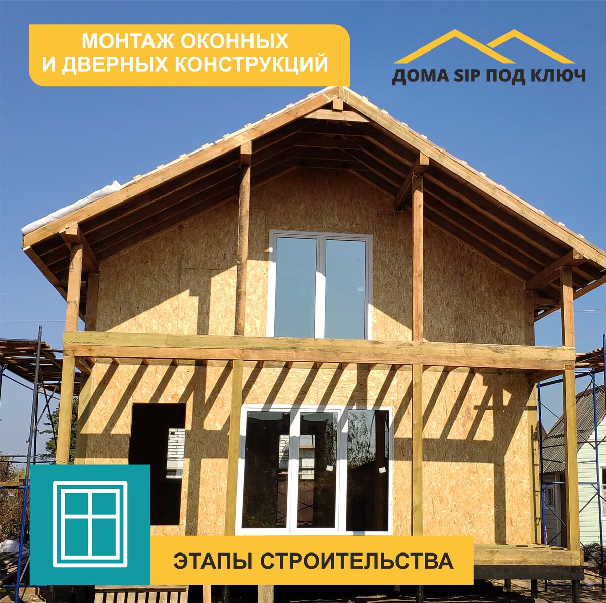 К дополнительным этапам строительства, таким как установка окон и дверей, можно приступать сразу после сборки коробки дома или чуть позже. Однако уже в процессе возведения стен строители готовят проёмы под эти конструкции в соответствии с проектом. ✅В СИП-домах можно установить любые виды окон. Но оптимальным вариантом на сегодняшний день являются металлопластиковые окна. В стандартную комплектацию от «ДСПК» входят окна ПВХ Brusbox (2-х камерный стеклопакет, подоконники, москитные сетки) Перед установкой окон проёмы обрабатываются специальным составом, который обеспечивает качественную пароизоляцию. Ветро- и гидроизоляционная пленка используется для покрытия проемов с наружной стороны – она позволяет максимально качественно утеплить окно и защитить от продувания. Затем оконные конструкции тщательно выравниваются в вертикальной и горизонтальной плоскости и максимально прочно закрепляются в проеме при помощи специальных монтажных пластин. Оставшийся небольшой зазор устраняется с помощью