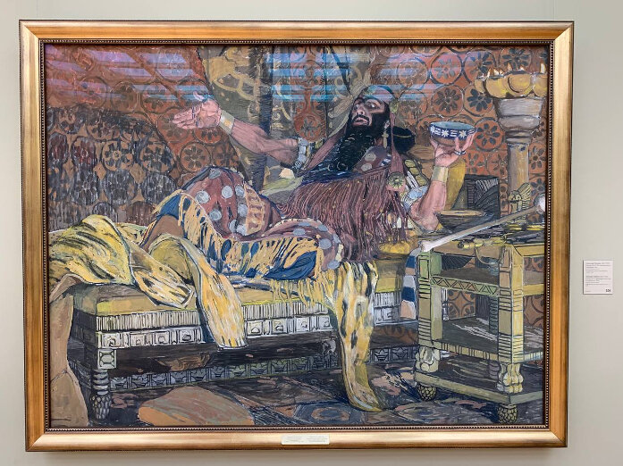 Что на картине? Шаляпин-Олоферн возлежит на роскошном ложе в пышно убранном шатре, держа в правой руке чашу, а в левой надменным жестом указывая вперёд.