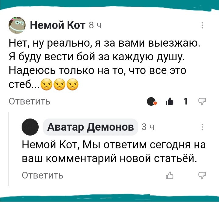 Догнали, как я воспринимаю подобные комментарии? Нет, я не запрещаю любые высказывания, я лишь хочу, чтобы читатели понимали моё отношение к подобным предложениям. И то, что я никогда добровольно не пойду на разрыв со своими Демонами.