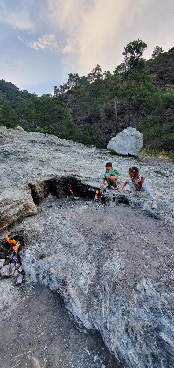 В Турции недалеко от Кемера расположена загадочная гора Химера. Мы не смогли не посетить это место, когда отдыхали в Кемере. Мы приехали на машине оставили ее на парковке и пошли в гору по тропе, идти минут 20 спокойным шагом с детьми. Гора Химера – необычная вершина возле турецкого поселка Чиралы, на склонах который постоянно возгорается природный газ, образуя языки пламени. Огненная гора сложена из серпентина или змеевика и считается самой мистической достопримечательностью Турции. Эта легендарная вершина была известна с древних времен. Именно она описана в «Илиаде» Гомера как место, где обитало ужасное чудовище. Время от времени пламени меняют свою интенсивность и месторасположение. В древние времена их высота достигала 2 метров, и корабли, проплывающие вдоль берегов Турции, использовали их в качестве маяков. В наши время туристы со всего мира и местные жители устремляются на вершину необычной горы, чтобы посмотреть на это необычное явление. На горе можно устроить пикник и пожарить